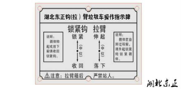 在勾臂式垃圾車裝載垃圾前,空載運轉(zhuǎn)達到 6 個標準氣壓時,掛上取力器(駕駛室內(nèi)方向盤左下方), 檢查各部件有無泄漏或異常后,再按照操作指示牌指示位置進行操作; 操作手柄指示牌如圖: