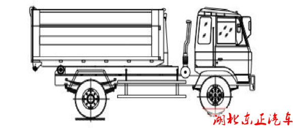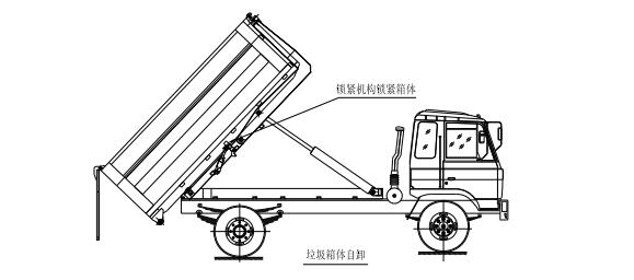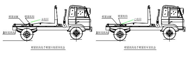 該車是由汽車底盤、拉臂主油缸、附車架、翻轉(zhuǎn)架、支撐腿(選裝)、鎖緊架、鎖緊油缸及多路換向閥等組成。翻轉(zhuǎn)架一端連在附車架上,其另一端設有活動拉臂,中間安裝有 鎖緊系統(tǒng);活動臂油缸一端連在活動臂上,另一端連接在附車架上;鎖緊機構(gòu)通過鎖緊油缸的動作可以在箱體自卸時將附車架上的箱體與翻轉(zhuǎn)架及拉臂連為一體,在主油缸伸出時 形成自卸角,也可以通過鎖緊油缸的收回把翻轉(zhuǎn)架與附車架鎖緊為一體,利用主油缸的收回或伸出使活動拉臂將地下的垃圾箱拖拉至附車架上或從附車架上放回到地面。