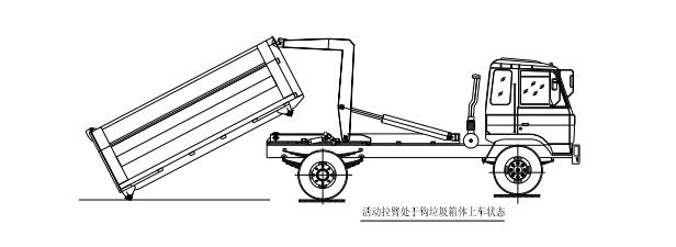 步驟 9. 垃圾箱放置好后,調(diào)整活動拉臂鉤與箱體彎鉤位置,使其脫鉤,將拉臂操作手柄推下到落下位置,拉臂油缸收回,活動拉臂繞翻轉(zhuǎn)翻轉(zhuǎn)架前鉸鏈軸旋轉(zhuǎn),活動拉臂放回到附 車架上,松開取力器垃圾箱放置完成,整車可以運輸行駛;