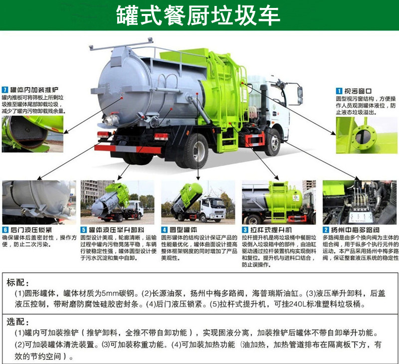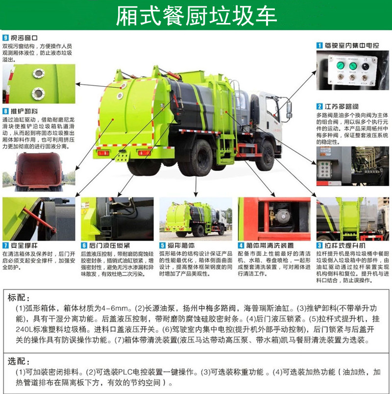 功能配置:箱體液壓舉升卸料,后蓋液壓打開(kāi)和鎖緊(帶耐磨防腐蝕硅膠密封條密封-后門關(guān)閉后滴水不漏),后蓋液壓雙重鎖緊裝置,掛桶式提升機(jī),可配合120升、240升標(biāo)準(zhǔn)垃圾桶使用。